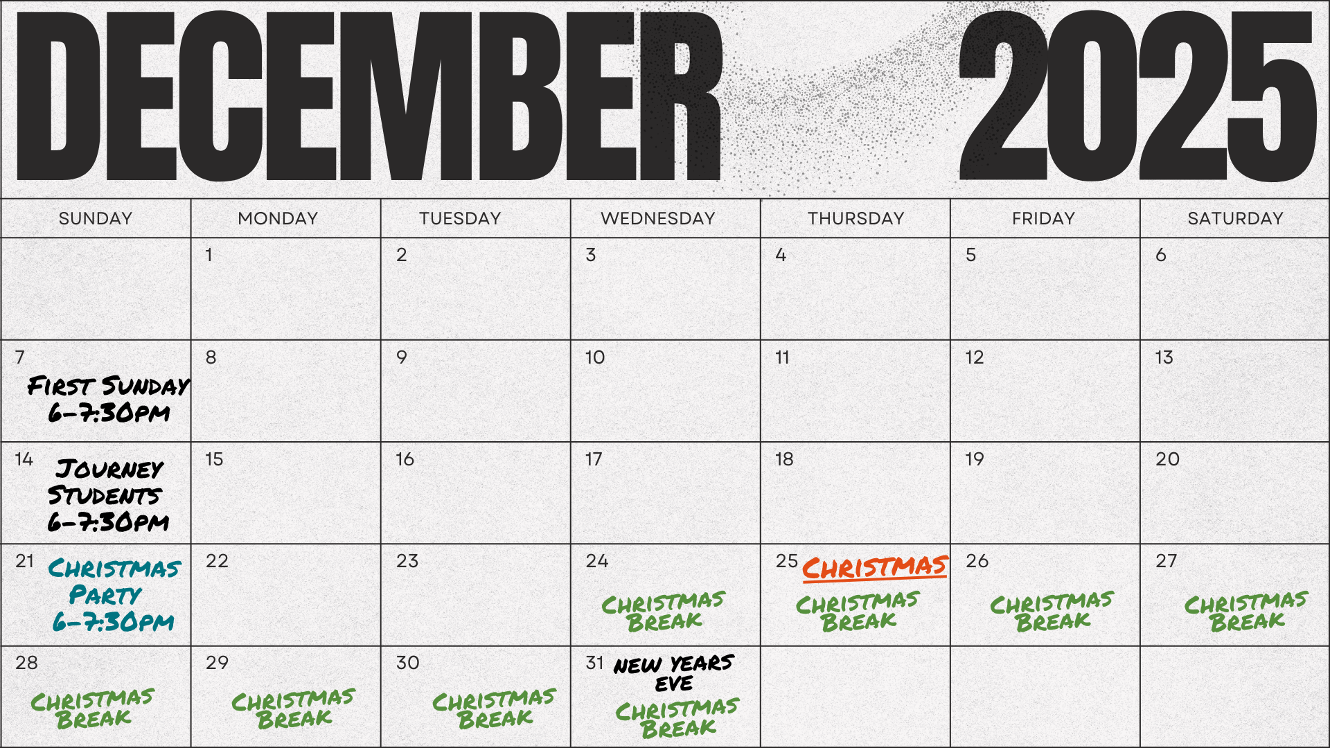 We can’t wait to see you at the Journey Student Christmas Party. We’ll have a gingerbread house contest, Yankee Swap, and some fun games. Bring your favorite christmas snack or drink. Come with a friend and a $5 yankee swap gift.